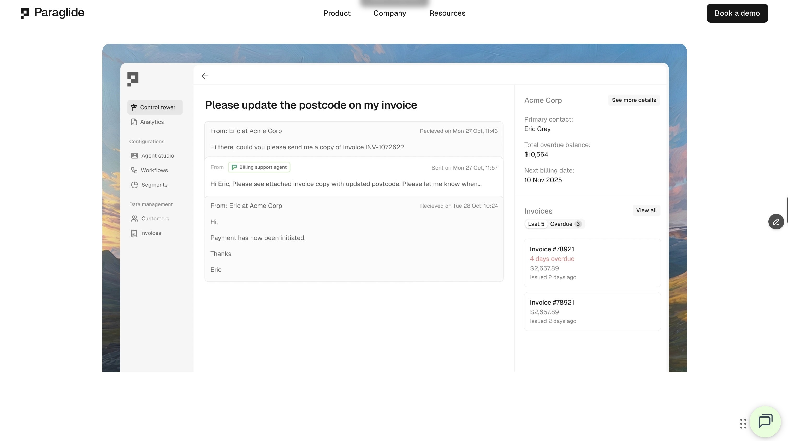 Paraglide builds AI agents for accounts receivable and collections. The Billing Support agent automates replies to customers' billing queries directly in the finance inbox. The Collection agent personalises collections at scale, automating outreach, replies, and follow-ups as complete conversations rather than one-off reminders. Paraglide's AI agents follow up in existing email threads with the full context of all previous conversations and payment history, so every interaction picks up exactly where the last one left off. Paraglide also manages disputes, deductions, and credit approvals.