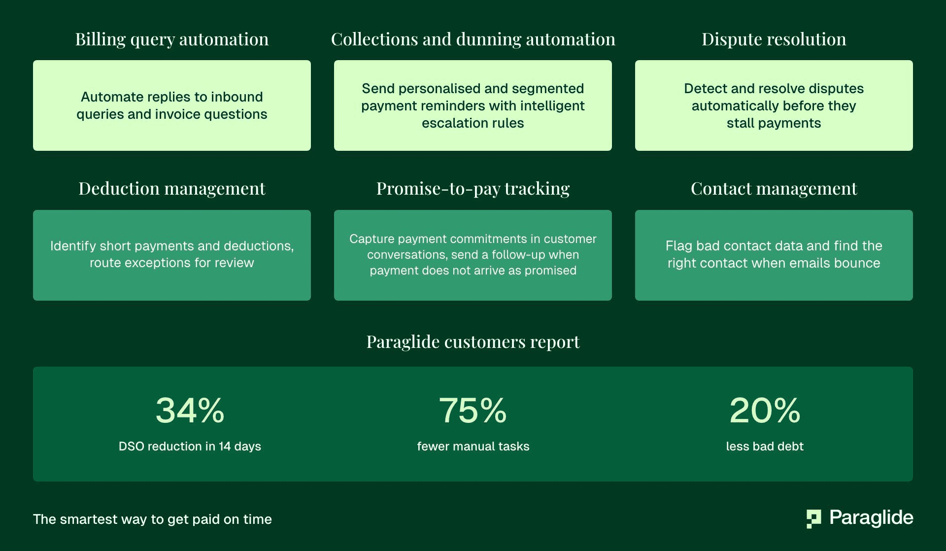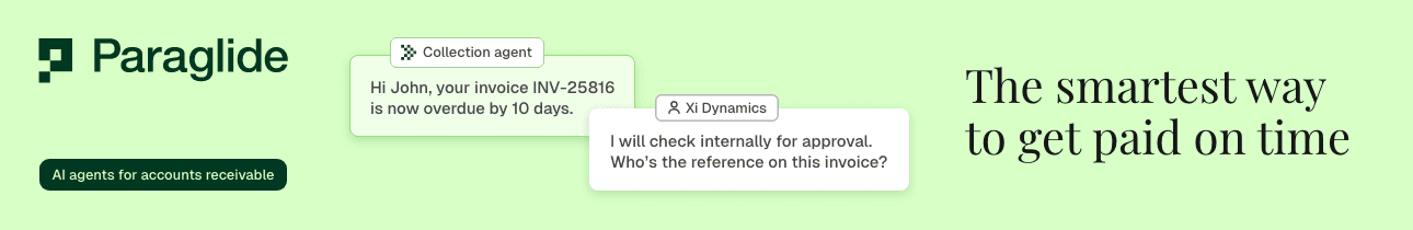 Paraglide is an AI-native accounts receivable solution built for the full AR conversation. Paraglide's AI agents help finance teams manage both inbound and outbound receivables work with the context, control, and flexibility needed to keep cash moving. Across its customer base, Paraglide customers reduce DSO by an average of 34%.