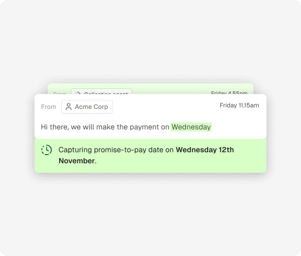 The agent captures customers' promise-to-pay dates and follows up automatically when broken. When customers confirm payment has been made, the agent asks for and captures payment confirmations