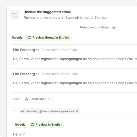 No more copy-pasting emails to Google translate. Paraglide atomatically understands and replies in your customers’ language, previewed in your native language